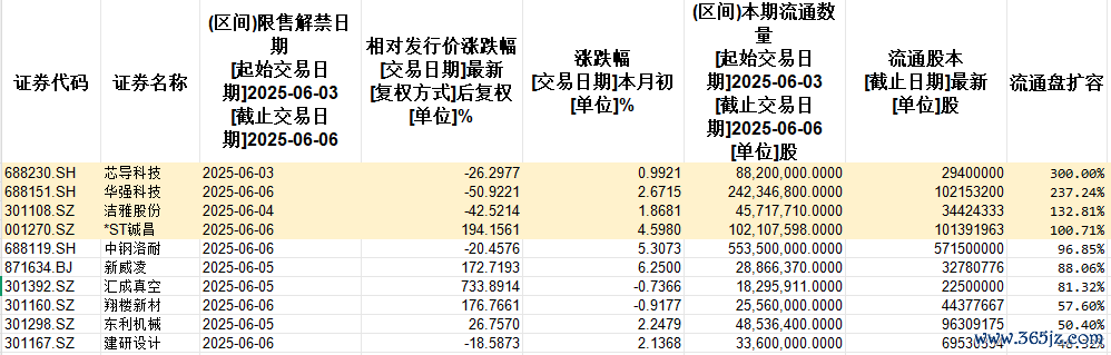 下周流通盘扩容超100%的股票将有4只,同样为芯导科技、华强科技、*ST铖昌,另外一家为洁雅股份。