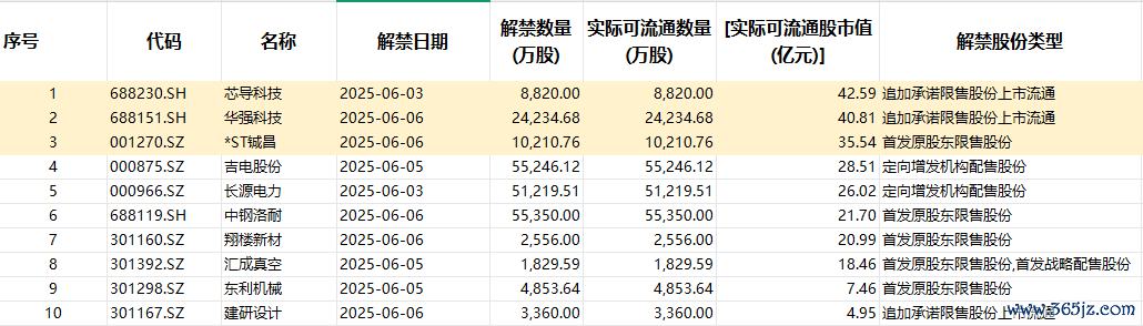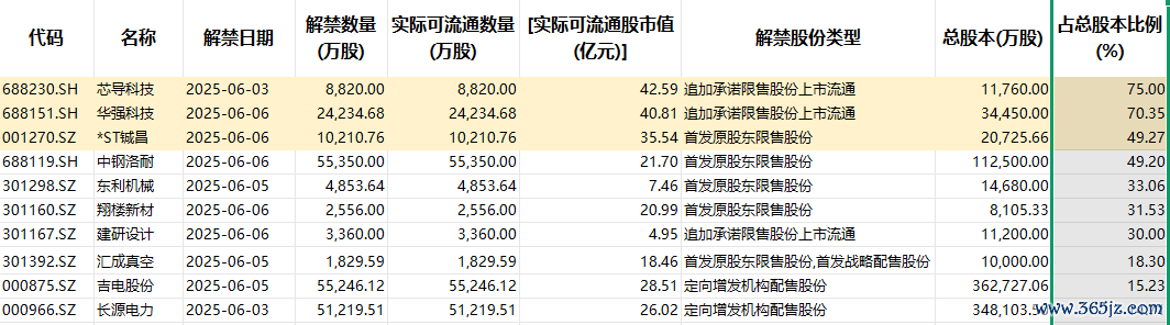 从解禁市值情况来看,上述54只股票按最新收盘价计算,芯导科技、华强科技、*ST铖昌解禁市值居前,解禁市值分别为42.59亿元、40.81亿元、35.54亿元,前两家为追加承诺限售股份上市流通,*ST铖昌解禁的是首发原股东限售股份。