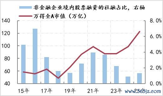 首先,A股反转且估值持续修复。“924”宏观政策转向后,市场出现了剧烈波动,并一度让市场人气低迷,年初DeepSeek的“出世”,让市场重新聚气,在科技牛与估值修复叙事的主导下,A股转入久违的牛市行情,至年底估值已升至123万亿,为2015年以来的最高水平。与此同时,2025年社会融资规模是35.6万亿,但其中非金融企业境内股票融资规模仅为4763亿,占社融比重仅1.34%,为2015年以来的次低水平。